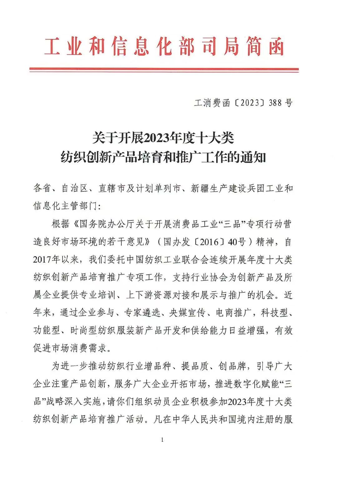 关于开展2023年度十大类纺织创新产品培育和推广工作的通知
